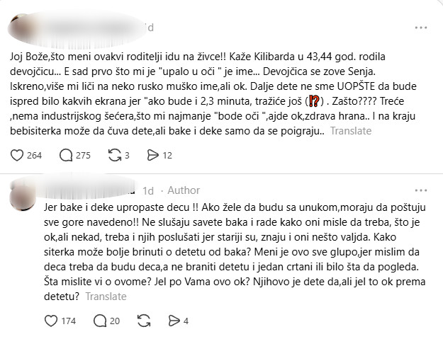 – Kaže Kilibarda u 43,44 god. rodila devojčicu… E sad prvo što mi je „upalo u oči “ je ime… Devojčica se zove Senja. Iskreno, više mi liči na neko rusko muško ime,ali ok. Dalje dete ne sme UOPŠTE da bude ispred bilo kakvih ekrana jer „ako bude i 2,3 minuta, tražiće još. Zašto???? Treće nema industrijskog šećera, što mi najmanje „bode oči „,ajde ok,zdrava hrana.. I na kraju bebisiterka može da čuva dete,ali bake i deke samo da se poigraju. Jer bake i deke upropaste decu !! Ako žele da budu sa unukom,moraju da poštuju sve gore navedeno!! Ne slušaju savete baka i rade kako oni misle da treba, što je ok,ali nekad, treba i njih poslušati jer stariji su, znaju i oni nešto valjda. Kako siterka može bolje brinuti o detetu od baka? Meni je ovo sve glupo,jer mislim da deca treba da budu deca,a ne braniti detetu i jedan crtani ili bilo šta da pogleda. Šta mislite vi o ovome? Jel po Vama ovo ok? Njihovo je dete da,ali jel to ok prema detetu?